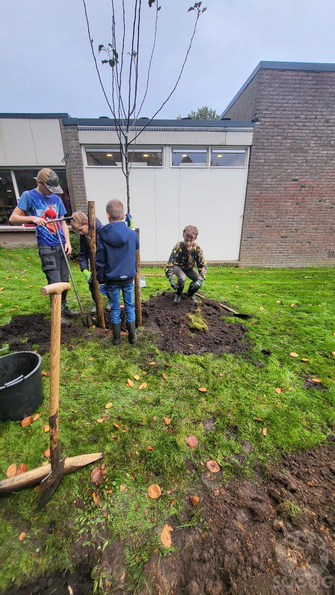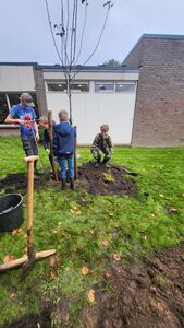 De week erna werd verder gegaan met het tweede deel van het project. Opnieuw stonden er enthousiaste leerlingen klaar, samen met de ‘Tuinraad’, vier VSO-leerlingen, hun groendocent en conciërge Hillie. Er werden vier nieuwe moestuinbakken geplaatst, twee appelbomen geplant, en de aardbeiplanten, bloembollen, knoflook en uien kregen hun plek. Ook het laatste zand werd verplaatst! Dankzij de betrokkenheid van ouders kon bovendien gewerkt worden met prachtige materialen: rode en gele uien, bloembollen, zaden, aardbeiplanten én zelfs twee kliko’s vol gereedschap, van vegers en harken tot een hand-grasmaaier en klein gereedschap. Dankzij hun bijdrage konden we niet alleen aanplanten, maar ook bouwen aan een goed uitgeruste tuin.